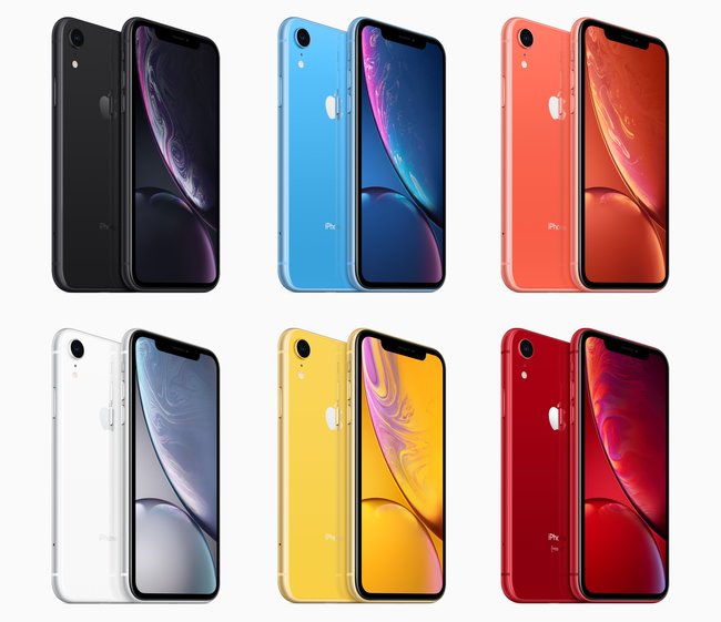 Упрощенная версия iPhone XS реализована в черном, белом, синем, красном, коралловом, жёлтом цветах.